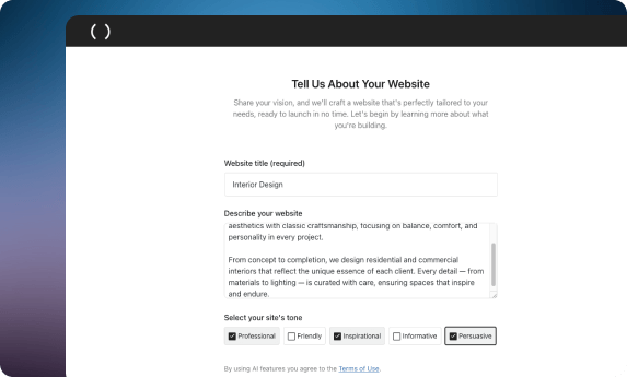 Comece por anotar todos os detalhes que deseja incluir sobre o seu site ou atividade. O AI Assistant do WordPress utilizará as informações fornecidas para criar o seu site e gerar conteúdo personalizado para cada página. O seu site estará pronto em minutos, com todos os textos já escritos pela IA.