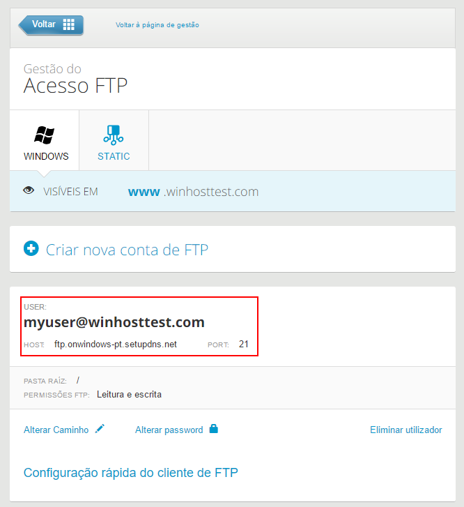 Os dados de ligação ao servidor FTP são apresentados junto da conta criada