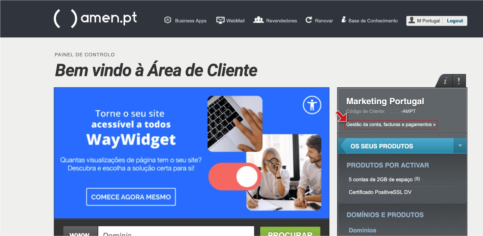 O cliente deve aceder à sua Área de Cliente da Amen.pt.