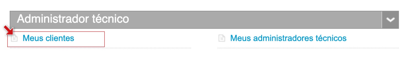 Na última secção, encontrarás "Clientes", dentro da área Administrador Técnico.
