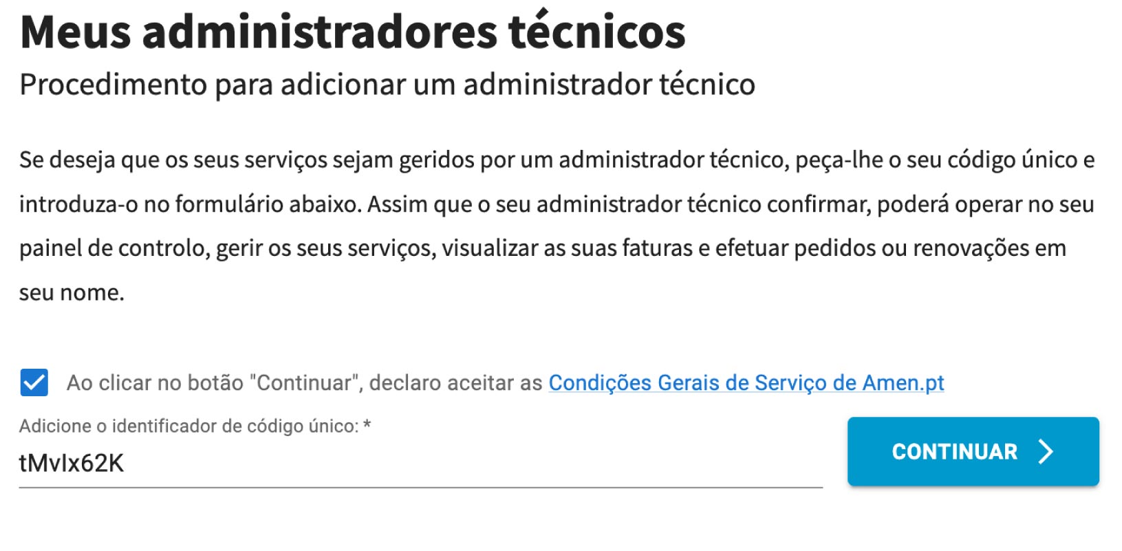 Para ser designado como Administrador Técnico, o utilizador deve ter uma conta ativa na Amen.pt, com número de cliente válido e dados pessoais verificados.