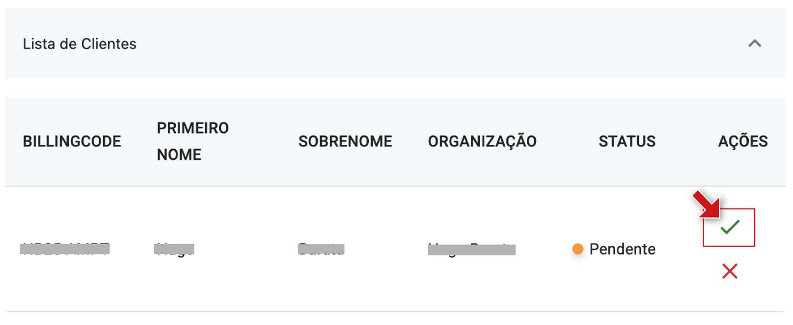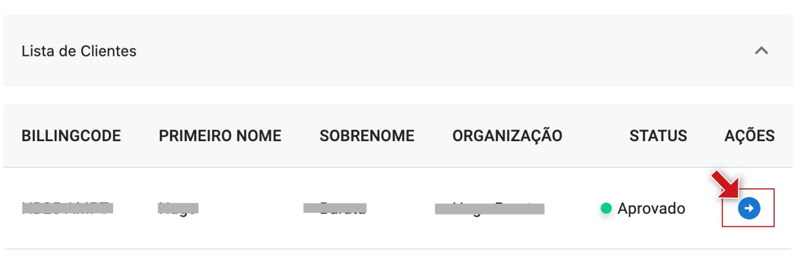 Para entrar no painel de um cliente específico, deve clicar no ícone azul com a seta, na coluna Ações.