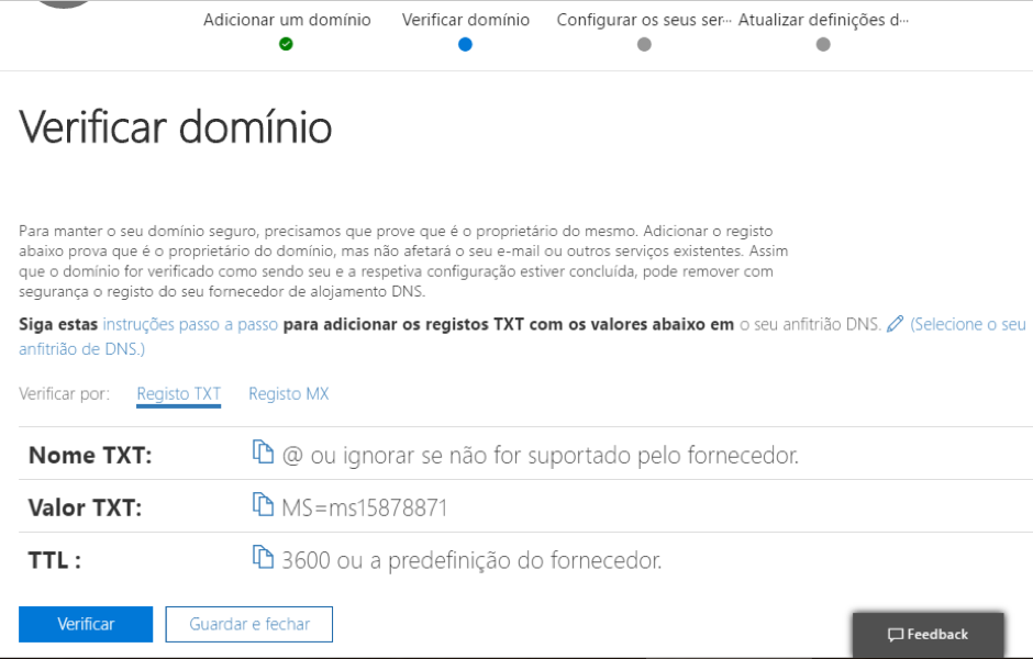 Irá surgir o menu de verificação de domínio que fornece um registo para ser inserido na zona DNS do cliente a fim de confirmar a propriedade do mesmo. Aceda à zona DNS do domínio e insira um novo registo do tipo TXT com o nome do domínio e o código fornecido como o seu valor (ex: “MS=ms15878871”)