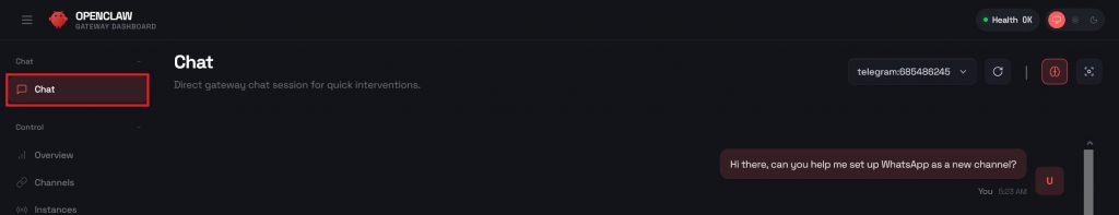 Para iniciar uma conversa com o OpenClaw, basta clicar em ‘Chat’ no menu do lado esquerdo e poderá começar imediatamente uma sessão de chat.