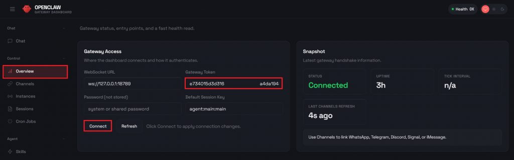Deve clicar em ‘Overview’ e colar o token copiado em ‘Gateway token’, depois clicar em ‘Connect’. O estado mudará para ‘Connected’ e poderá utilizar o painel sem mais problemas.