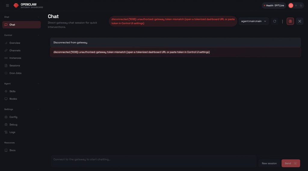 Ao abrir o painel OpenClaw através de 127.0.0.1:18789, surgirá uma mensagem de erro como na imagem abaixo. Este erro ocorre porque o token não está incluído no URL, por exemplo: