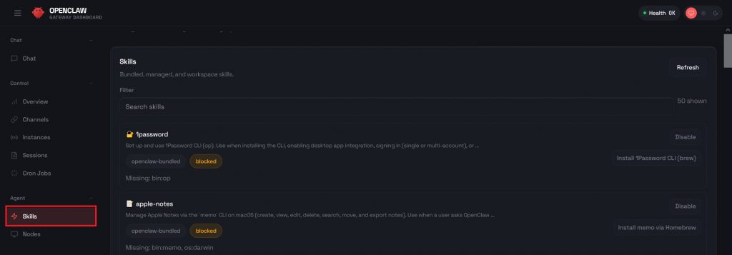 Prefere uma GUI? É igualmente simples: deve ligar-se ao painel OpenClaw e aceder à página ‘Skills’.