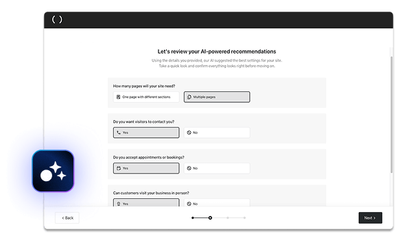 Diga ao AI Assistant do WordPress o que pretende alcançar com o seu site: vender serviços ou produtos, promover eventos, anunciar um negócio físico, direcionar tráfego para o seu site, receber chamadas telefónicas, etc. Selecione as opções desejadas e o AI Assistant adicionará essas funcionalidades ao seu site.